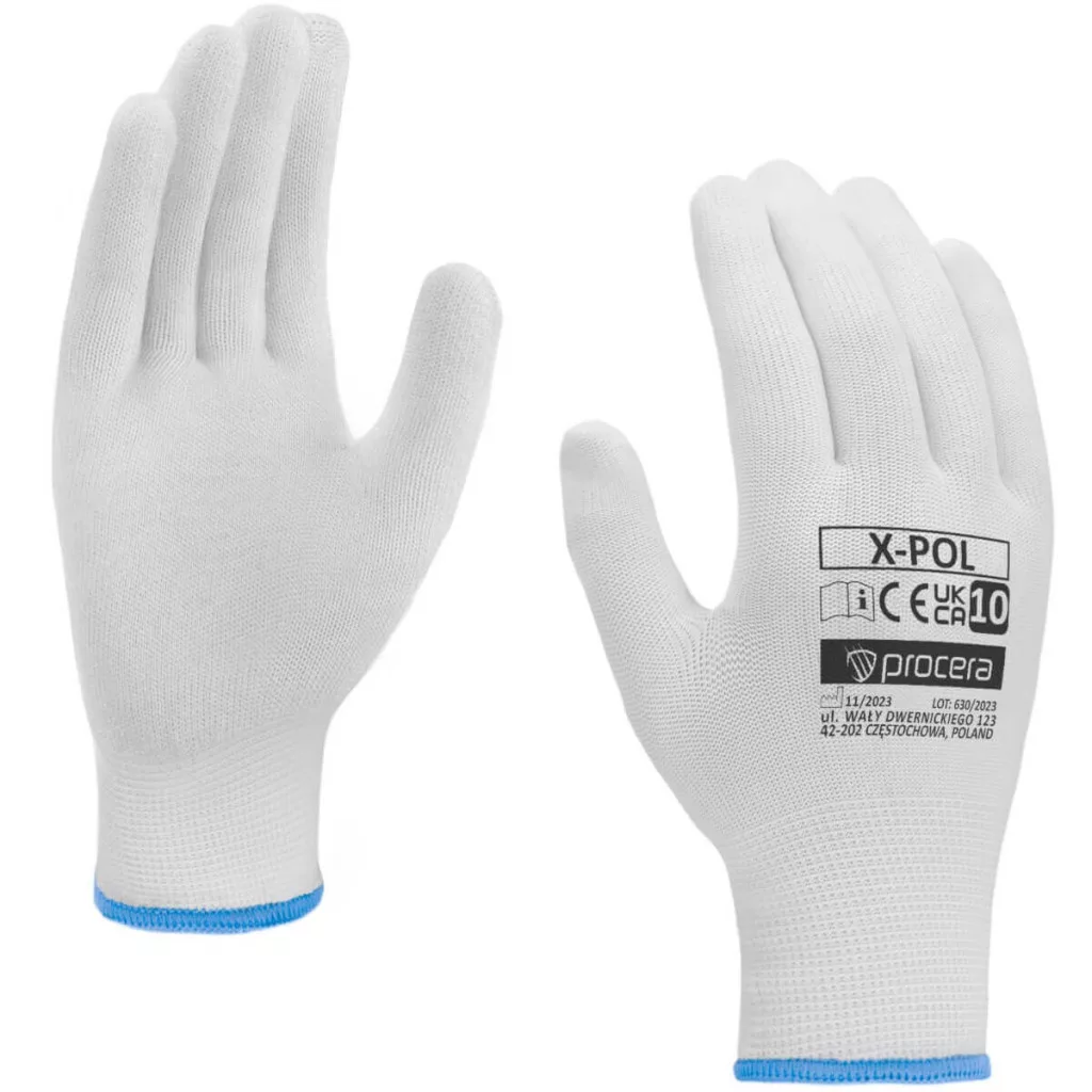 X-POL kesztyű poliészterből. Nagyon jó érzés a tartott tárgyról. Jól illeszkednek a kéz formájához. Rugalmas. Zsinórral befejezve. CE. Csomagolás: karton 12/300/600. Fehér szín.