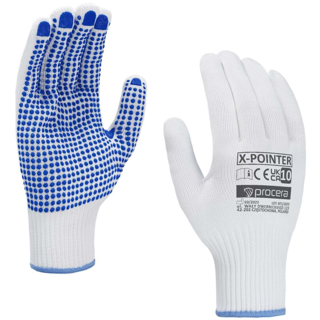 X-POINTER kesztyű poliészter kötött anyagból, PVC pöttyökkel a markolat oldalán, varrás nélküli, mandzsettával befejezve. Rugalmasak és rugalmasak, alkalmazkodnak a kéz formájához. A tartott tárgyak kiváló érzése. Kézi, vezérlési, gépészeti, szállítási, gyártási és egyéb munkákhoz tervezve. Szín: fehér/kék EN420:2003 Méretek: 7, 8, 9, 10