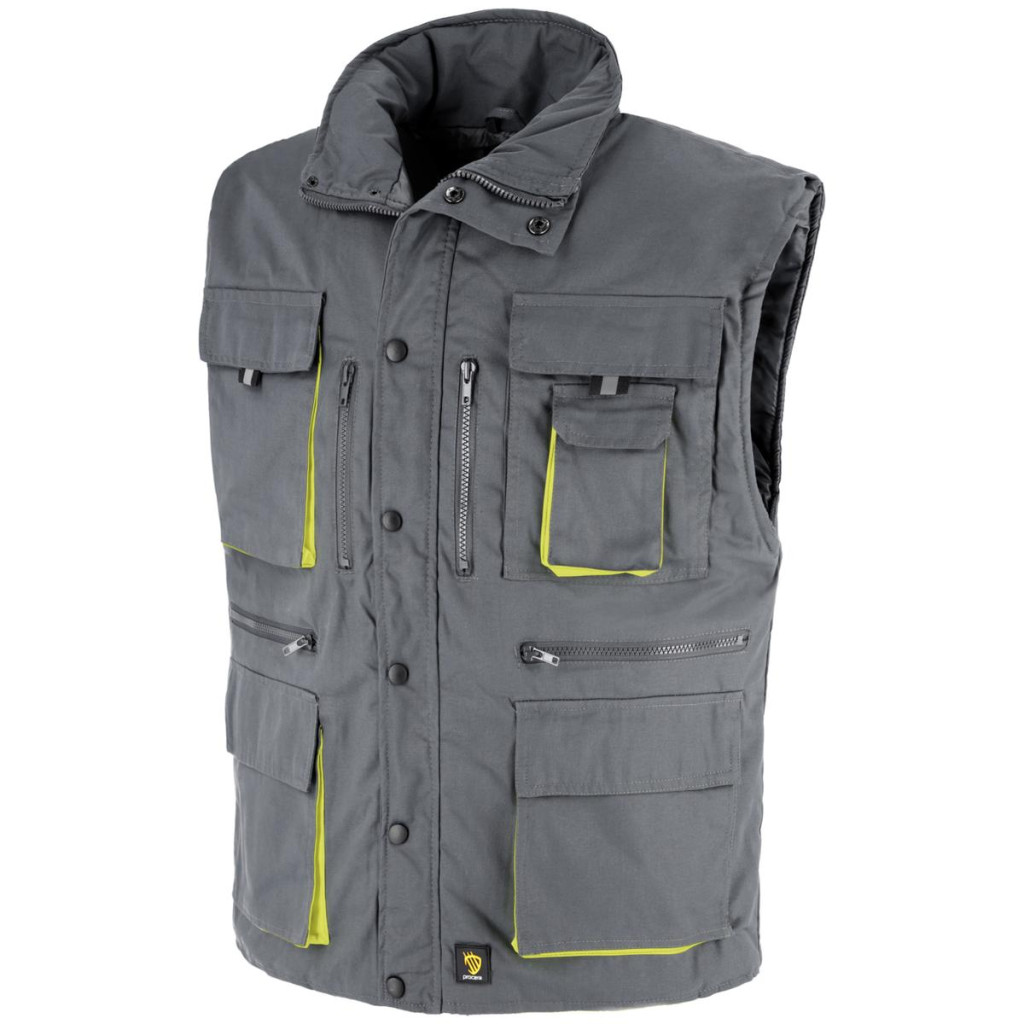 Hőszigetelt mellény 65% poliészter, 35% pamut külső anyagból. Meleg belső szigetelés, belül steppelt béléssel. Cipzáros záródás, csappantyúval rögzített hajtóka borítja. A magas állógallér, a mellény meghosszabbított hátulja és a karok körüli mandzsetták további hőkomfortot biztosítanak. Akár 11 funkcionális zseb. Méretek: M-XXXL. Csomagolás: 1/20 karton