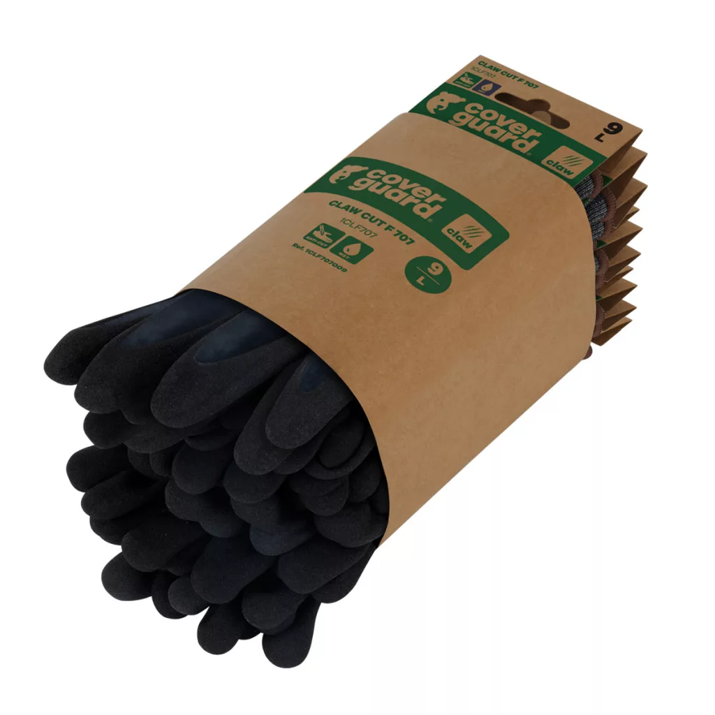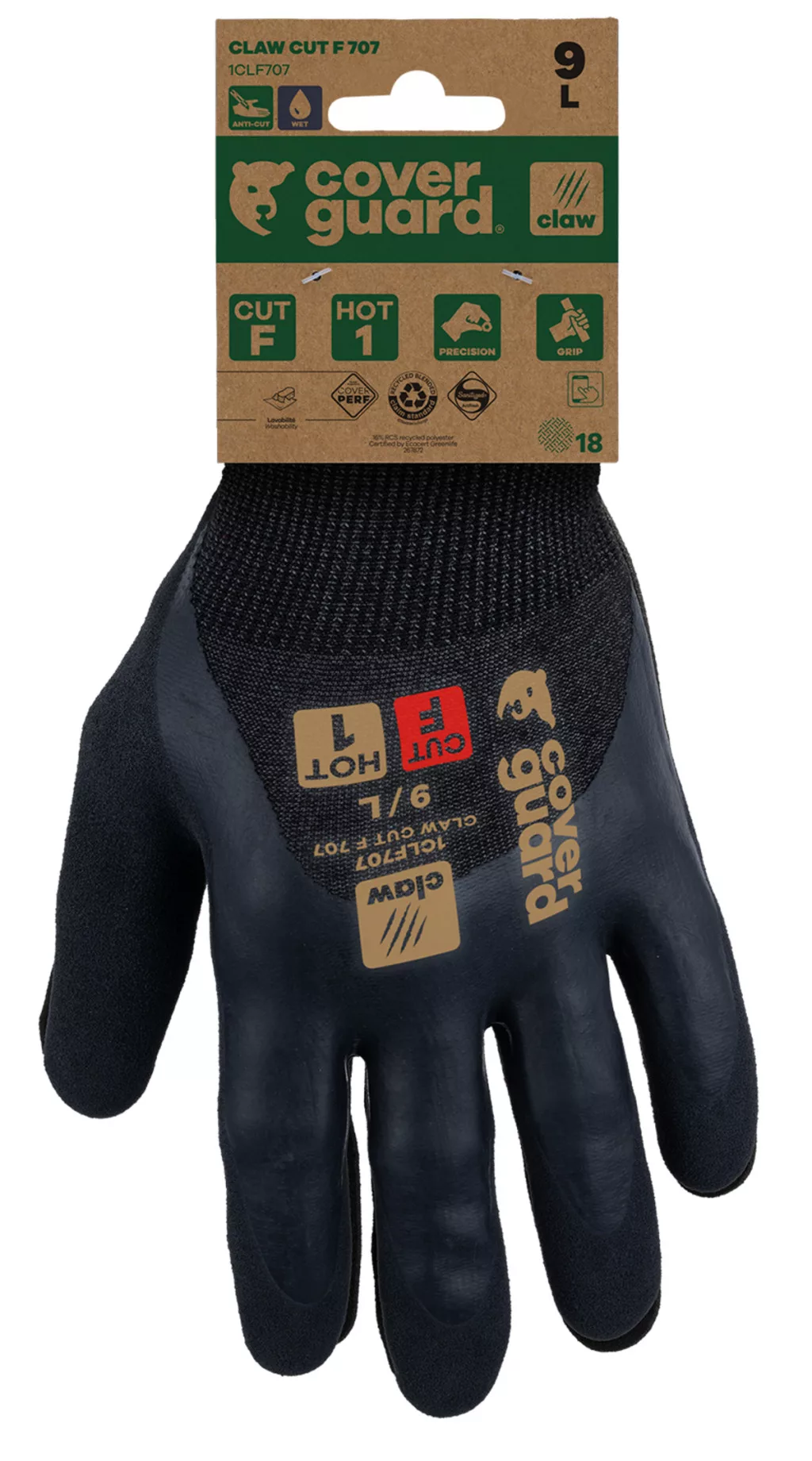 A CLAW CUT termékcsalád a vágásbiztos védőkesztyűk új generációját képviseli, melyet úgy terveztek, hogy a legkeményebb feladatok során is megvédjen a magas szinten nyújtott vágás elleni védelmmel (CUT D-től A9-ig). Kiváló kényelmet és kivételes fogásbiztosságot biztosít minden munkakörnyezetben (száraz, nedves és olajos).A CLAW CUT F 707 precíziós munkákhoz készült száraz és nedves környezetben való használatra.A 18-as finomságú kötés és a rendkívül puha, ugyanakkor erős szálak (HPPE, újrahasznosított poliészter, acélszál és spandex alapanyaggal) kivételes kényelmet biztosítanak, miközben a legmagasabb szintű vágás elleni védelmet nyújtják (CUT F az EN 388 szabvány szerint).A dupla latexbevonat (Ökölcsontig sima nitril + tenyérén csúszásbiztos sandy felülettel) vízálló, és kiváló fogásbiztonságot biztosít még a legmegterhelőbb munkakörülmények között is – legyen az nedves vagy száraz.A CLAW CUT F 707 újrahasznosított poliészterből készül, és RCS-tanúsítvánnyal rendelkezik (a termék teljes tömegének 16%-a újrahasznosított).A kesztyű érintőképernyő-kompatibilis, így nem kell levenned a kesztyűt digitális eszközök használata közben.Sanitized higiéniai kezelés: megelőzi a baktériumok és kellemetlen szagok kialakulását