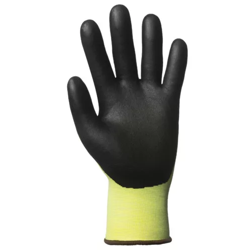 18-as kötésű, varrás nélküli, fluo sárga színű, vágásbiztos HPPE + nylon + elasztán védőkesztyű, Tenyerén fekete szellőző mikrohabosított nitril mártásKötött mandzsetta