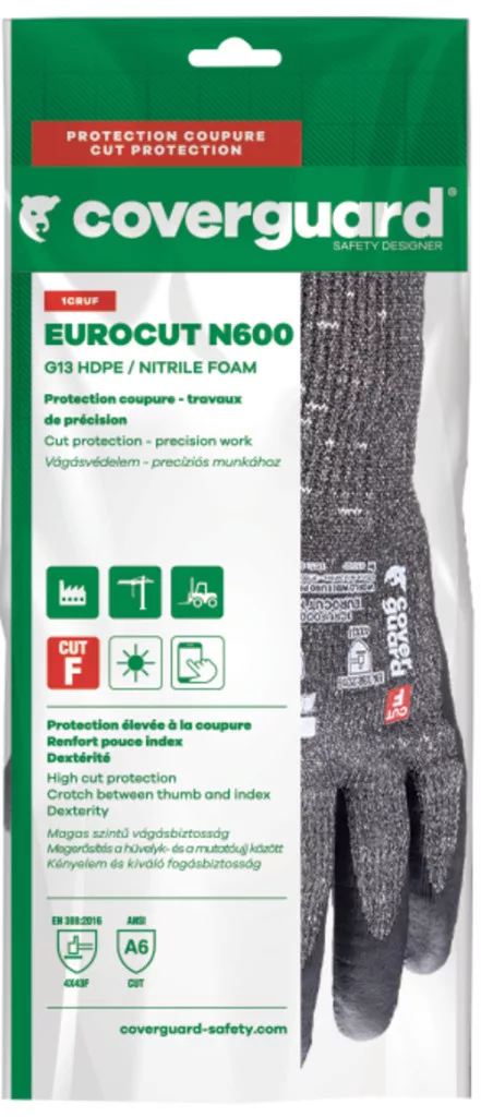 * maximális szakítás- és kopásállóságú, a legmagasabb F szintű TDM vágásbiztossággal, 13-as kötésű, kényelmes, multiszálas (HPPE, poliészter és spandex alapanyagú) fekete védőkesztyű