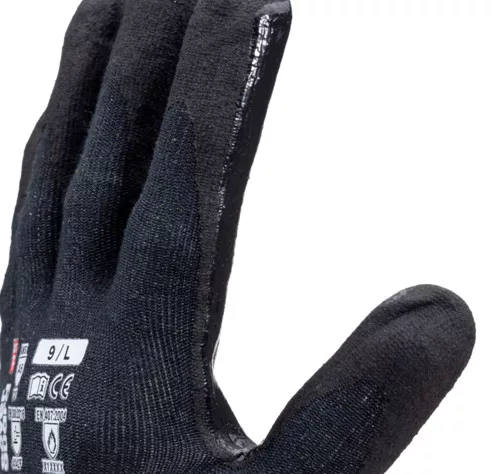 * maximális szakítás- és kopásállóságú, a legmagasabb F szintű TDM vágásbiztossággal, 18-as kötésű, vékony multiszálas (HDPE, para-aramid és spandex alapanyagú) fekete védőkesztyű