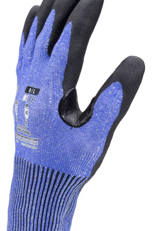 * maximális szakítás- és kopásállóságú, C szinten TDM vágásbiztosságú, 13-as kötésű, multiszálas (HDPE, poliészter és spandex alapanyagú) kék fogásbiztos védőkesztyű