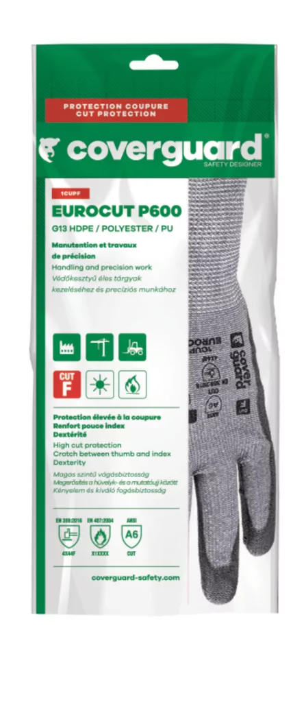 * maximális szakítás-, szúrás- és kopásállóságú, a legmagasabb F szintű TDM vágásbiztossággal, 13-as kötésű, multiszálas (HDPE, poliészter és spandex alapanyagú) szürke védőkesztyű