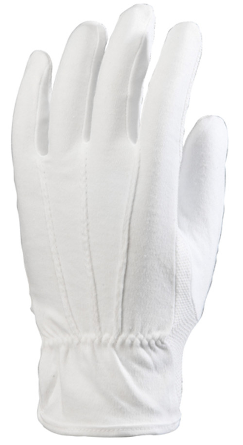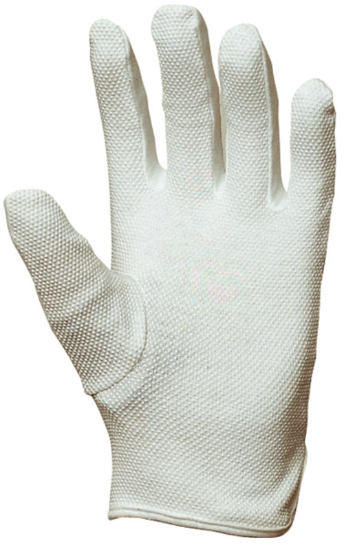 Fehér színű, 100% pamut védőkesztyűTenyéren csúszás elleni speciális mini PVC pöttyözésEgyenes csuklórésszel