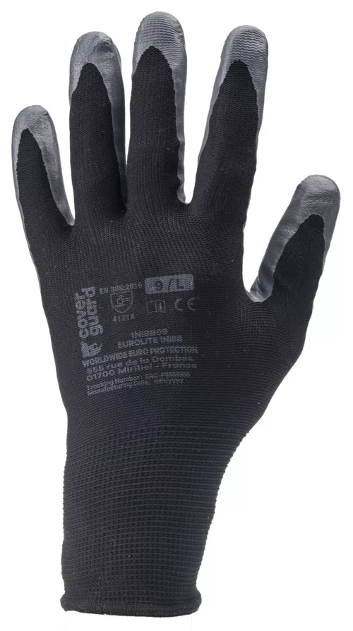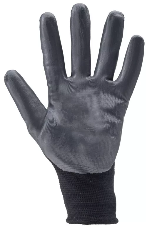 SZÜRKE TENYÉREN NITRIL MÁRTOTT SZERELŐKESZTYŰ: • fekete, kiválóan kézre illeszkedő, 13-as kötésű, poliészter alapkesztyű • tenyerén szürke kopásálló nitrillel mártott • gumírozott, rugalmas mandzsetta, szellőző kézhát • méret: 9-es • csomagolás: 120/12 • EU szabvány: EN420, EN388: 4121