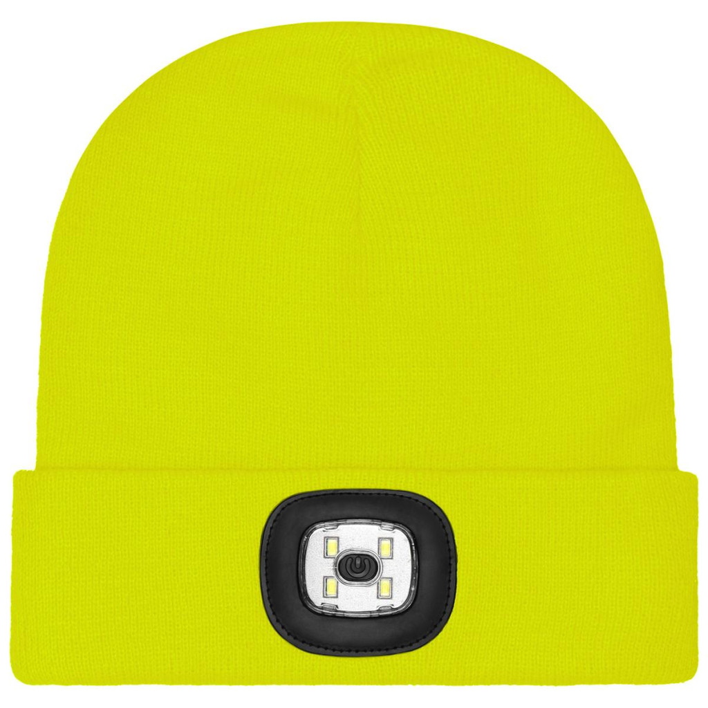 Élénk sárga színű téli sapka, 100% akril összetételű kötött anyagból. A sűrű szövés kényelmes hőérzetet biztosít hideg körülmények között. A sapka kivehető, USB-csatlakozón keresztül tölthető LED-lámpával rendelkezik, három világítási fokozattal. Univerzális méret. Csomagolás: 10 db / 200 db karton.