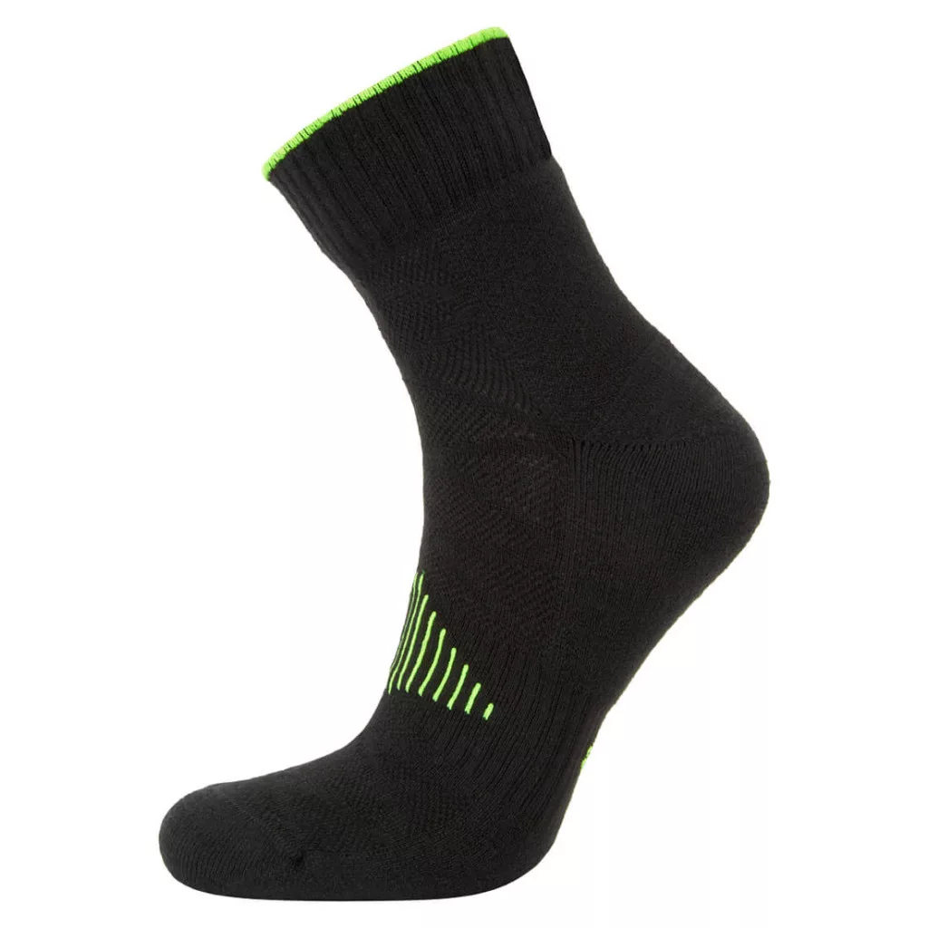 Ez a zokni újrahasznosított fonalból készült, és komfortos felsőrésszel, lapos varrással és technikai orrkialakítással rendelkezik. A sarok megerősítése, a párnázott talp és a rugalmas boltozat fokozza a támogatást és a kényelmet. A zokni bordázott szárral és szellőző zónákkal rendelkezik, amelyek biztosítják a puha és kényelmes viseletet.
