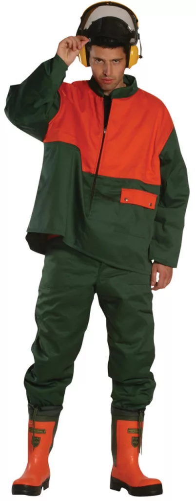 * kopásálló poliészter és szellőző pamut alapanyagok keveréke * az elejerészeken, a vállaknál és az ujjakon kilenc rétegű, aramidszálas vágásvédő betét * véd 20 m/s láncsebességű láncfűrész által okozott vágó hatás ellen * zöld színben, narancs rátéttel, hosszított hátrész, öt zseb, végig biztonsági cipzár