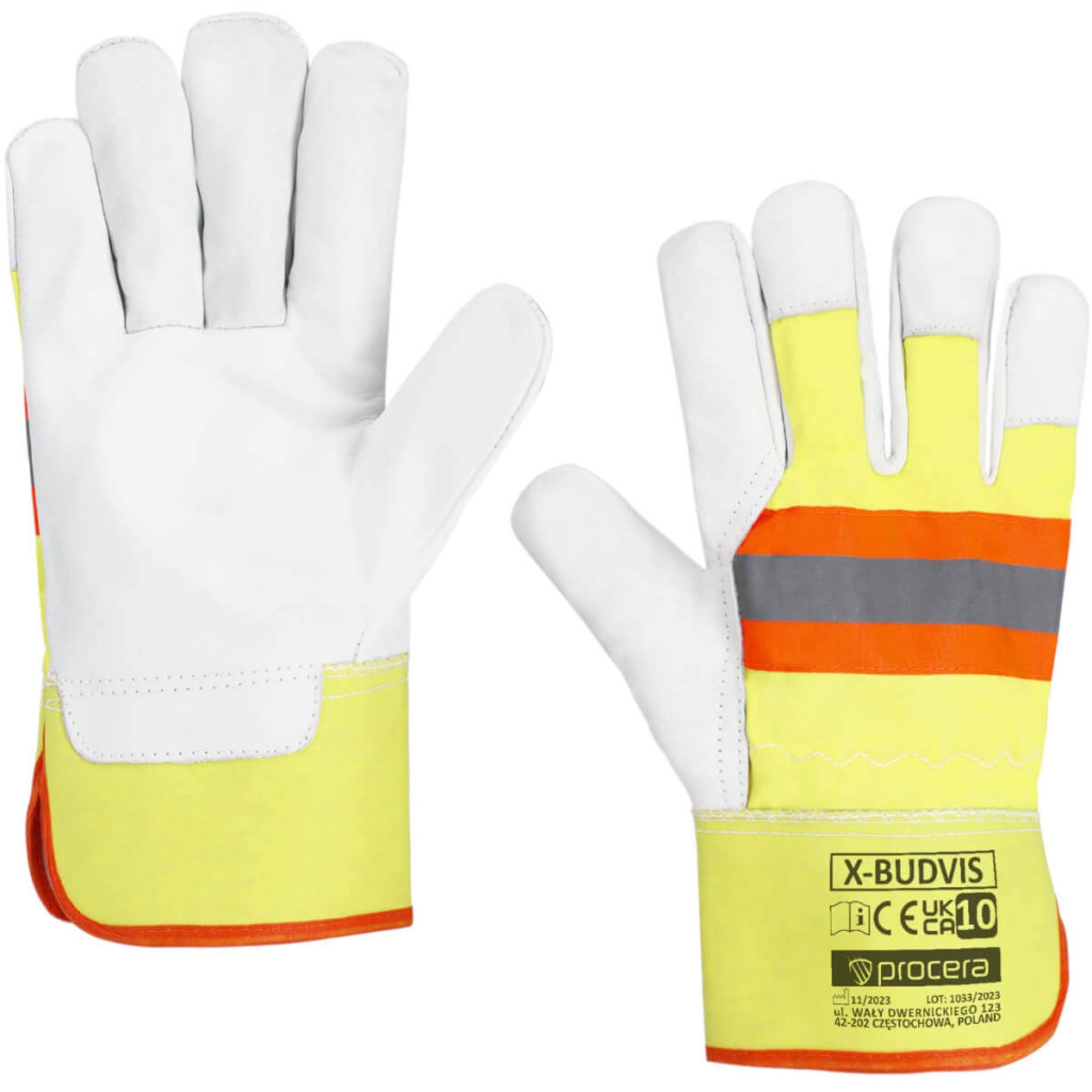 X-BUDVIS kecskebőrrel megerősített munkakesztyű, teljes tenyérig érő, élénksárga farmer szövet, további fényvisszaverő csíkkal. A fogórész egy darab bőrből készült. Rugalmas szalag a mandzsetta felett. Megerősítés a kézközépcsontok vonalán és az ujjbegyeken. Gumírozott farmer mandzsetta tömítéssel. A belső markolat bélelt. CE EN 21420:2020. Gyűjtőcsomagolás: 72 pár. Méret: 10.