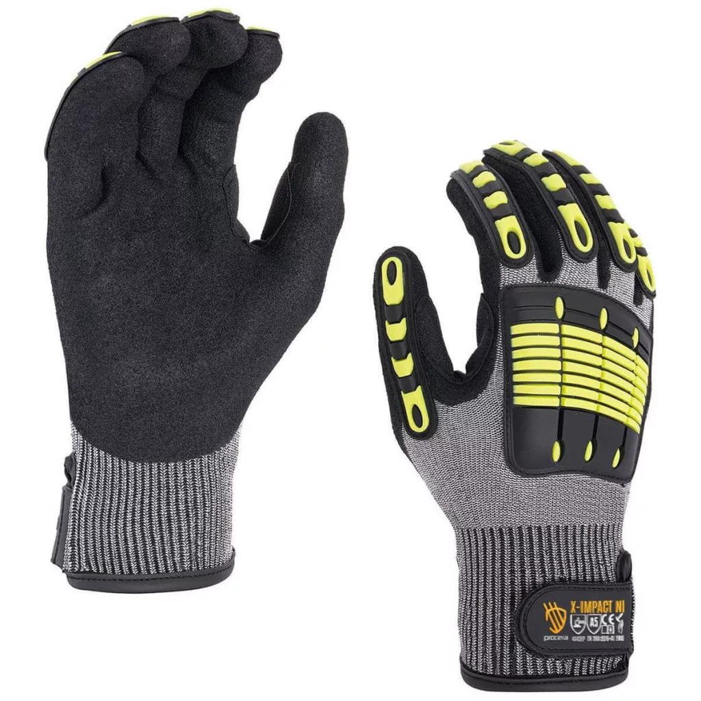 X-IMPACT NI Vágásgátló, ütésvédő kesztyű UHMWPE fonalból. A markolat része habosított nitrillel bevonva. Tépőzáras mandzsettával befejezve. A felső rész TPR technológiával készült, amely védi az öklöket és az ujjakat az ütésektől. További varratokkal és ellenálló anyaggal megerősítve a hüvelykujj és a mutatóujj közötti részen. EN420, EN 388:2016 – 4X43EP. 1 pár külön tasakba csomagolva.